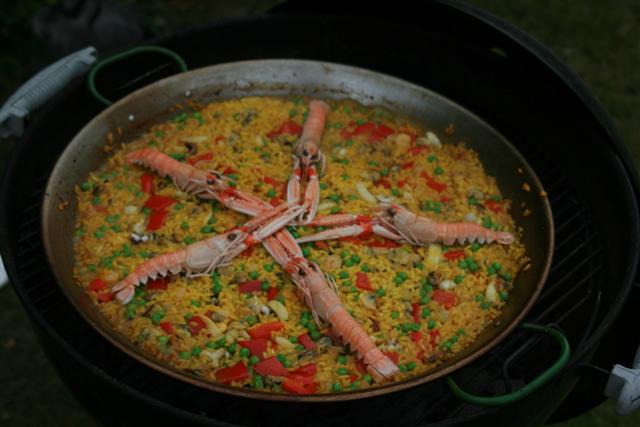 Paella er egentlig oprindeligt den spanske version af biksemad og derfor kan det i teorien mikses på mange forskellige måder, men der er alligevel visse traditionelle paellaer. Navnet oprinder af den specielle pande med to håndtag som den tilberedes i – paellador. En ordentlig paellapande er for stor til et almindeligt komfur, og er som regel beregnet på at blive brugt på gas. Jeg har ikke gas, så enten bruger jeg en stor stegepande eller sautépande, eller også tager jeg min paellador til 6-8 personer og stiller mig ud i haven ved kuglegrillen. Det er lidt svært at styre varmen, men hvis det hele er parat går det alligevel – og hvis man lige har lyst til lidt ekstra smag, kan man jo “komme til ” at lægge låget på de sidste 5-10 min 😉